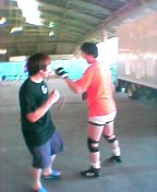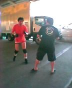 | ここで休憩。セブンイレブンへ買出しだ。帰ってきたら、何やらアマチュアストリートマッチが行われていた模様(笑)。携帯で撮ってみた。
