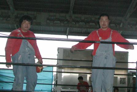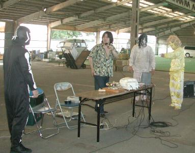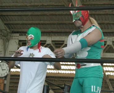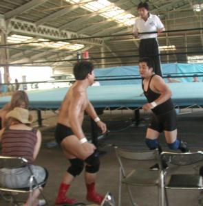 14時10分頃にチケットを購入して会場入り。今日は3方向に椅子が1列。先週の週プロの中カラーで国際茅ヶ崎の告知があったので、集客が期待されるところではあったのだが、いやー、その甲斐あってか集まりましたよ。25人・・・・・・・・あれ?いつもと一緒だな。つか、いつもよりか少ないかも。まぁ、暑いから、仕方ないねー。ちなみに、隣のフットサル場では、日本代表が極秘のハンド特訓をしていたとの情報もあったが、定かではない。 さて、茅ヶ崎青果市場。暑いとは言っても、屋根があるので、日陰になり、そんなに驚くほど暑くはないかな?などと思いながら、怪しいBGMが流れる中、開始を待つ。このBGMは何?なんかアジア系のポップスのようですが、これも会場さんの趣味かな?ボケーっと聞いていると、アイアンマン登場。本部席に座って何をするのか?と思ったら、BGMチェンジだった。今度は、ラテン系の曲になりました(笑)。更にちょっとい待つ。お、会場さん登場。14時35分位だ。そろそろかなと思ったら、トイレの案内と、「本日、全試合終了後、スナックGTにて全選手参加による飲み会が開催されます・」という案内を重ね重ね行って、また控え室に戻ってしまった。どうやら、某選手が到着するのを待っているらしい。