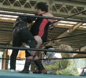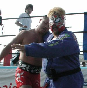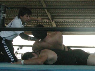 | 大塚はいろんな体制から関節技を極めるが、なんとかファントムがロープエスケープ。まぁどっちかといえば、U系っぽい試合と言えなくもなくもないが、その割には場外乱闘で若いお姉ちゃんのところに自ら突っ込んでいったりしていたような。試合は大塚の攻撃を切り返したファントムが一瞬の脇固めでギブアップ勝ち。 |