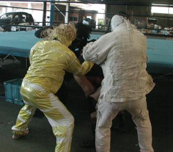 | 場外乱闘では率先しておねえちゃんのいる方に突っ込んでいく2人。 | マウントを取ったデラムエルテ。 |