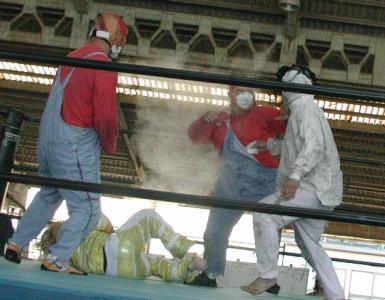 | なかなか変幻自在な関節技を仕掛けるデラムエルテ。 | ハッスルポーズを見せたファントム。 |