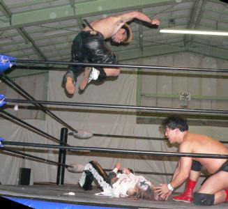 | 先にisamiが入場。isamiはてっきり対戦相手がケン片谷だと思っていたらしい。SHURAが出てきて驚いた様子。「片谷じゃないのかよ〜」しかし、客席からは、「いや、あれ片谷ですよ。」「片谷ですよね。」という声が相次ぎ、一部の客からは、しきりと「片谷〜」という声援が飛んでいた。両者ともジュニアなので、結構華麗な空中殺法などが繰り広げられたり、SHURAのエグイドロップキックなどの攻防があったり、SHURAの「俺は片谷じゃない〜!」という魂の叫びがあったりしたが、結局15分時間切れ引き分け。規程による延長は無し。 |