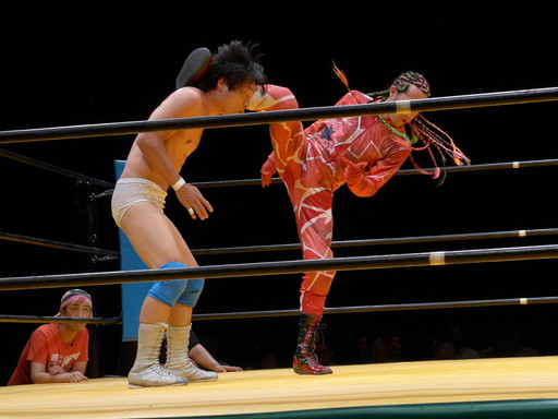 場外に逃げた見た目に、回転式ブランチャを見舞うMITSUMOTO。メヒコ仕込み。