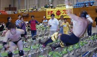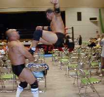 | 相島のキックで吹っ飛ぶマンゲル | マンゲルは相島をロビーに連れ出す | 椅子を使ってのドロップキック |