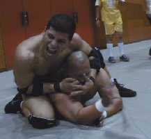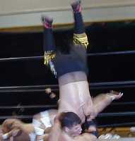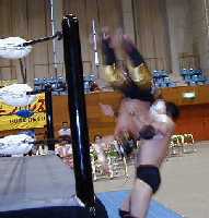 | クーガーの飛び技をキャッチする相島 | まだまだクーガーは飛ぶ | これがフィニッシュだったかな? |
