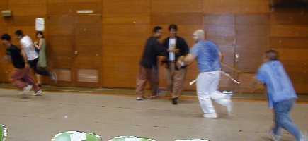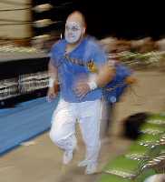 | 4WAYコーナーってのは、4人の選手が同時に戦うっていう試合形式で、どうやら、場外カウントなしで、会場全体が戦場になるらしい。つー訳で、初っぱなから、場外乱闘全開。マンゲルと相島はロビーに飛び出して灰皿壊してるし、クーガーと水前寺はステージで乱闘。水前寺がクーガーにスライディングキック@ステージを出してたし。 でも、凄い試合だった。この試合形式はヒットだなぁ。みんな走り回って大興奮で大満足だったみたい。 |