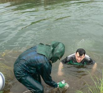 釣りに興じていた参加者も一斉に対岸を見る。おぉ、なんと、対岸には謎の怪人っぽい生き物が歩いている。これがひょっとしたら、噂の河ギラスなのか?おそらくそうに違いない。こんな怪人に埼玉の平和を乱す奴は許さないとばかりに、飛田はいきなり川に飛び込んだ。河ギラスもそれに呼応して飛び込んだ。水中の大決戦だ。そして、釣り大会に参加していた佐野直が川の上から、この2人の戦いを見守っている。