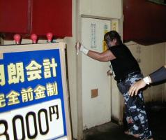| その後、明朗会計3000円の看板の近くで乱闘し、ようやく駐車場方向へ戻っていく。しかし、戻っていく途中にも、閉まっている店のシャッターにぶつけあったりして。そして、駐車場に戻ったが、今度は自転車置き場で乱闘。自転車を1台倒して、ようやくリングに戻ったのだった。
